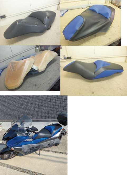 ![]() | ヤマハ グランド・マジェスティ400 シートヒーター組み込み&表皮張替 中古のスペアのシートを購入され、冬に備えてシートヒーター組み込み&表皮の張替のご依頼をいただきました。 ノーマルと同じように滑り止め柄のレザーを使用しています。 縫製無しの一枚張りは結構難しい作業でした。 |