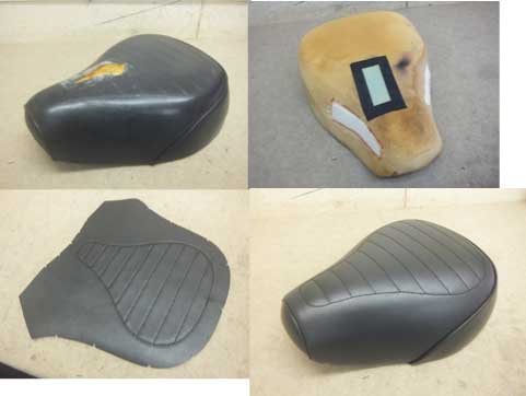 ![]() | ホンダ TL125 ウレタン加工、トランスネット挿入& 表皮張替え 購入されたときからシートが改造されていたのと前下がりがきつくて、乗っているとシートの細い箇所にずれてきてお尻が痛くなるということで、前下がりの解消、シート幅の拡大、トランスネットの挿入のご依頼をいただきました。 前部を3cmほど高く、幅はシートフレーム幅いっぱいになるようにウレタン加工をしました。 表皮はノーマルのサイド部にネームが入っていることもあり、そのまま使用して欲しいとのご希望でした。 |